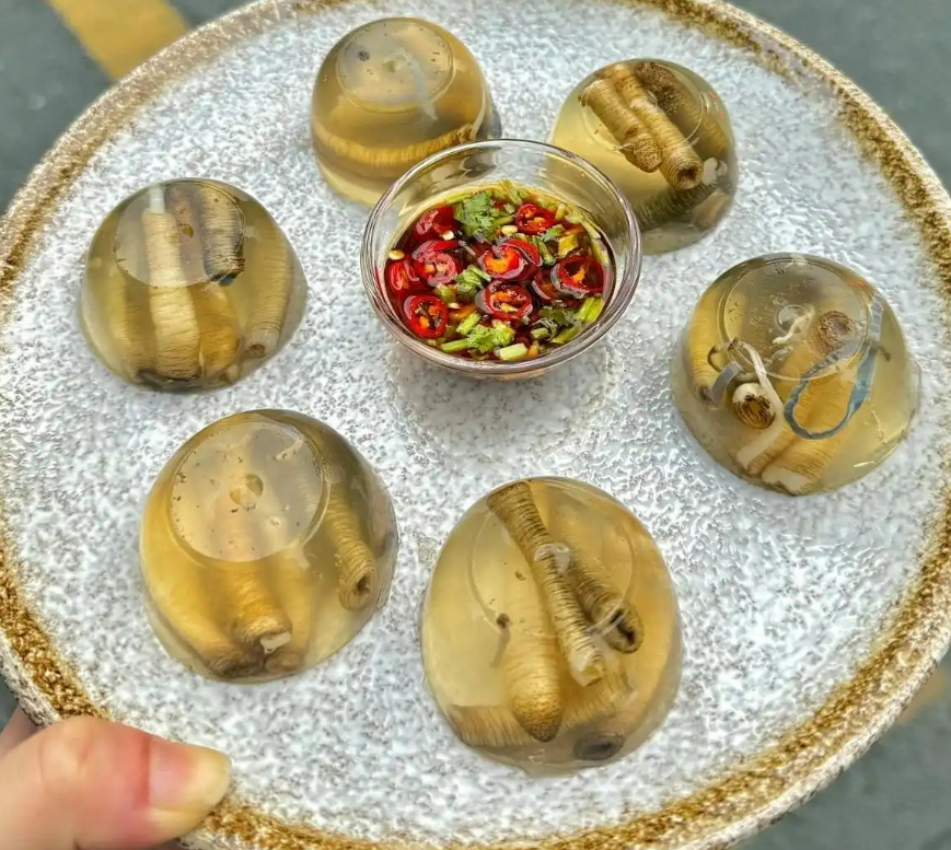A distinctive Minnan snack, sea worm jelly is made from Sipunculus nudus (locally called “tǔsǔn”), a type of sea worm found in coastal mudflats. When boiled, the worm’s natural collagen cools and solidifies into a crystal-clear jelly, resembling gelatin. Served with soy sauce, vinegar, wasabi, minced garlic, and chili shreds, it’s QQ and smooth, with a fresh seafood sweetness balanced by the zesty 调料. Refreshing and cooling, it’s a perfect summer treat—its unique taste is definitely worth a try.