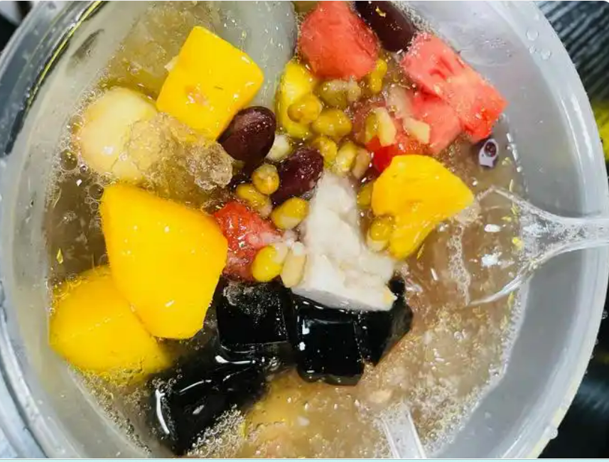 The most popular summer dessert, despite its name, “four fruits soup” offers over 20 ingredients to choose from, including grass jelly, seaweed jelly, taro balls, red beans, and barley. Topped with osmanthus syrup or rock sugar syrup, it’s icy, sweet, and refreshing. With varied textures in every spoonful, it banishes summer heat instantly.